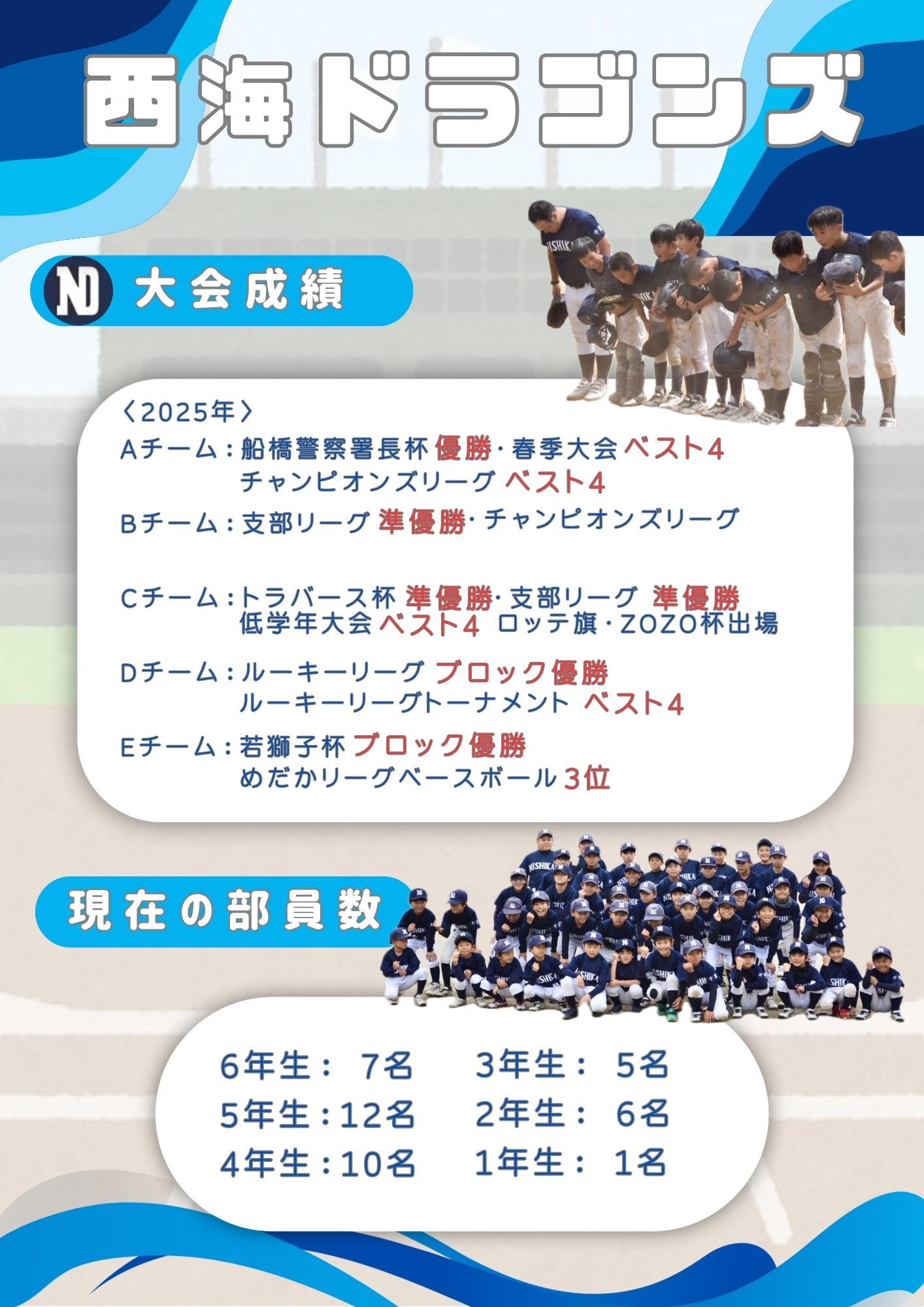船橋市野球協会少年野球学童部第2支部に所属していて、少年学童部及び支部の大会はもちろん、色々な大会に参加しています。